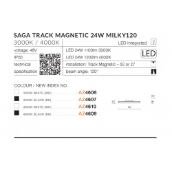 Saga 60 track magnetic 24W milky 120 to prosta, metalowa szyna, w której umieszczono pojedyncze zintegrowane źródło światła LED o wysokiej żywotności i niskim zużyciu energii elektrycznej. Z zewnątrz okrywa je mlecznobiała osłona, przyjemniej rozpraszająca światło. Lampa występuje w dwóch wersjach kolorystycznych – białej i czarnej, co pozwala łatwo połączyć ją z innymi akcesoriami do systemu oświetlenia na szynoprzewodzie.