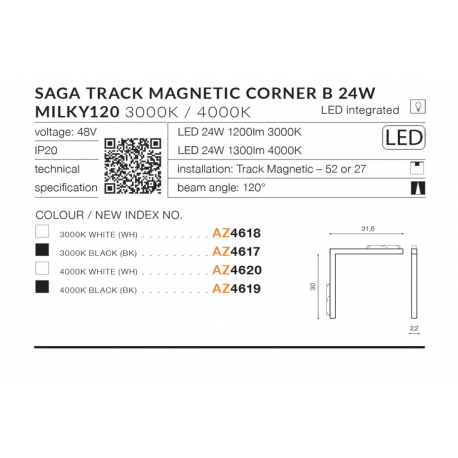 SAGA 30 MAGNETIC CORNER B 24W 3000k LAMPA DO 1-fazowego SZYNOPRZEWODU MAGNETYCZNEGO AZZARDO AZ4617