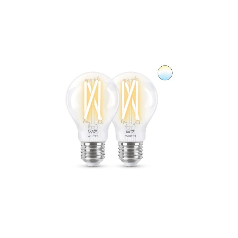 Inteligentne oświetlenie w stylu retro dzięki żarówce WiZ z widocznym spiralnym żarnikiem i trzonkiem E27, która może świecić ciepłym lub chłodnym światłem białym. Za pomocą aplikacji WiZ lub przy użyciu poleceń głosowych możesz przyciemniać i rozjaśniać światło lub korzystać z zaprogramowanych trybów oświetlenia w konfiguracjach Wi-Fi.